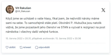 „Naše reakce odpovídá závažnosti obvinění, která dnes byla zveřejněna. Rozhodnutí předsednictva bylo jednomyslné,“ řekl po jednání mimořádného předsednictva předseda hnutí STAN Vít Rakušan.